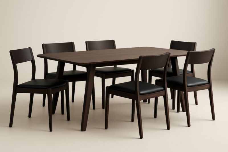 Set Sala da Pranzo Tavolo Rettangolare in Legno Massello Marrone con 6 Sedie in Legno e Seduta in Pelle Nera