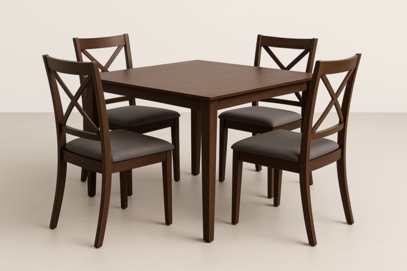 Set Tavolo Quadrato in Legno di Noce Marrone con Sedie Imbottite Grigie